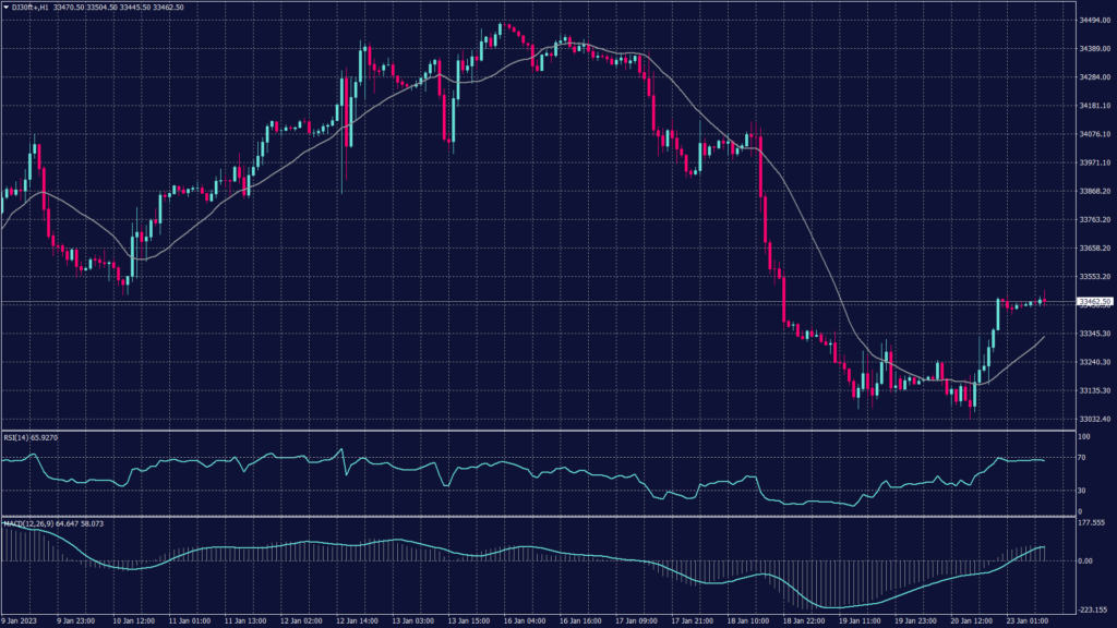 نجح مؤشر داو جونز في اختراق مستوى المقاومة المتمثل في مستويات 33,250 مما اعطى السعر دفعة إيجابية والاستفادة من الزخم الإيجابي لمؤشر MACD مع تجاوز مؤشر القوة النسبية المستوى 50 على إطار ساعة واحدة ، ولكن يتداول السعر في نطاق سلبي إذا لم يتم كسر مستويات 33,450 حيث تعد هذه النقطة بمثابة نقطة المحور التي يمكن أن تعكس مسار السعر.