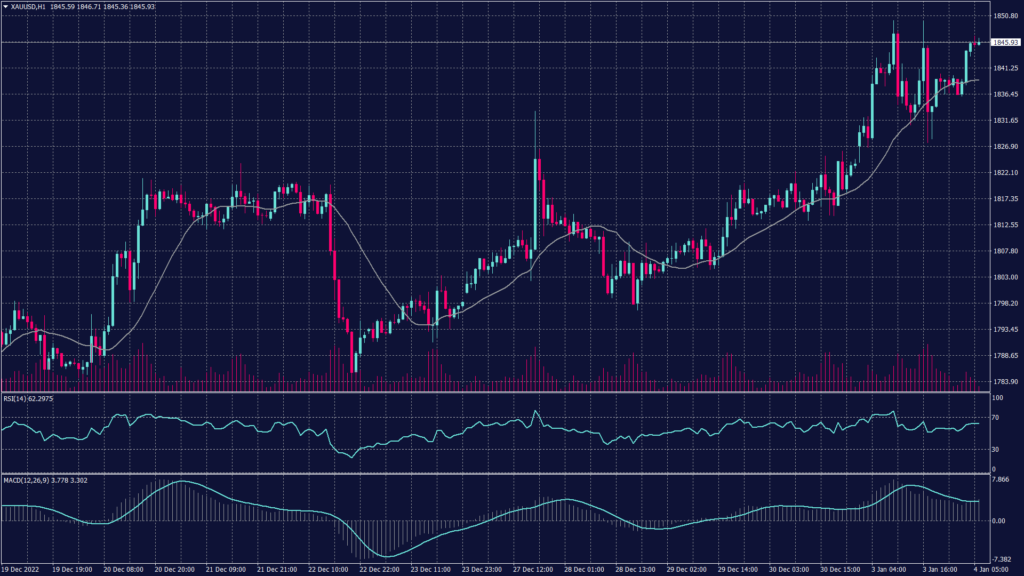 Spot gold daily chart shows a continuation of the uptrend while the hourly chart shows fluctuations between 1,840 and 1,850. On the hourly chart, RSI shows overbuying and signals a possibility of a decline to relieve the buying pressure, meanwhile, the MACD intersects with the moving average and signals a divergence and a slight decline.