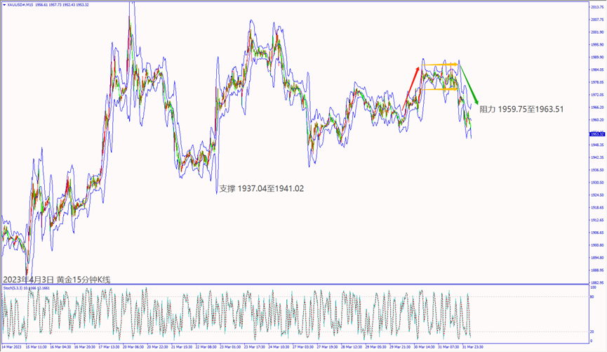 日级别线图,长阴烛掼破5日均线,1970.00关口冲不过,可能下探1940美元;15分钟K线,出现箱型反转,布林带中轨反压,大有可能回测前低支撑。