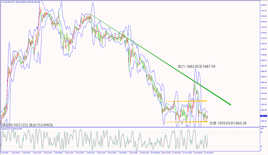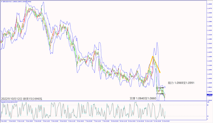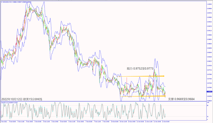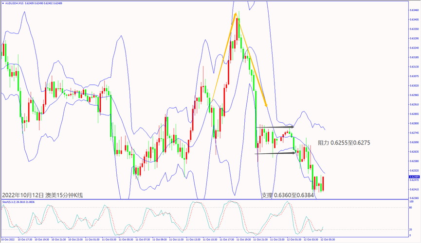 今天(12日)澳州联储助理主席表示澳大利亚中性利率可能至少为2.5%,暗指未来加息幅度放缓利淡澳元,澳美冲不过小时布林带中轨0.6271,建议可短空操作。预期今天欧洲央行行长拉加德重申10月维持加息利好欧元,欧美若守住小时布林带下轨线0.9669,建议可短多操作。预期周四(13日)清晨美联储货币会议纪要表示持续加息抑制通胀利好美元,镑美冲不过小时布林带中轨1.0985,建议可短空操作。