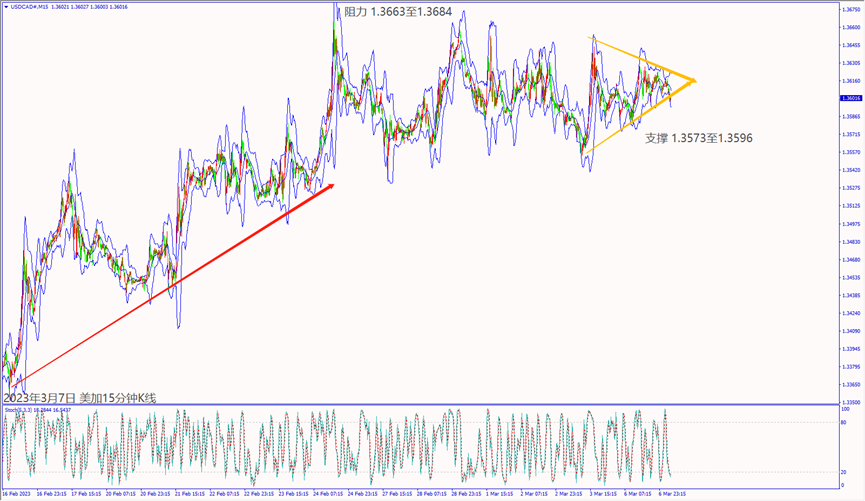 日级别线图,近7天在5日均线附近震荡,守住该均线,有望启动涨势;15分钟K线,对称三角形整理,一旦突破趋势线,有机会挑战上方阻力。