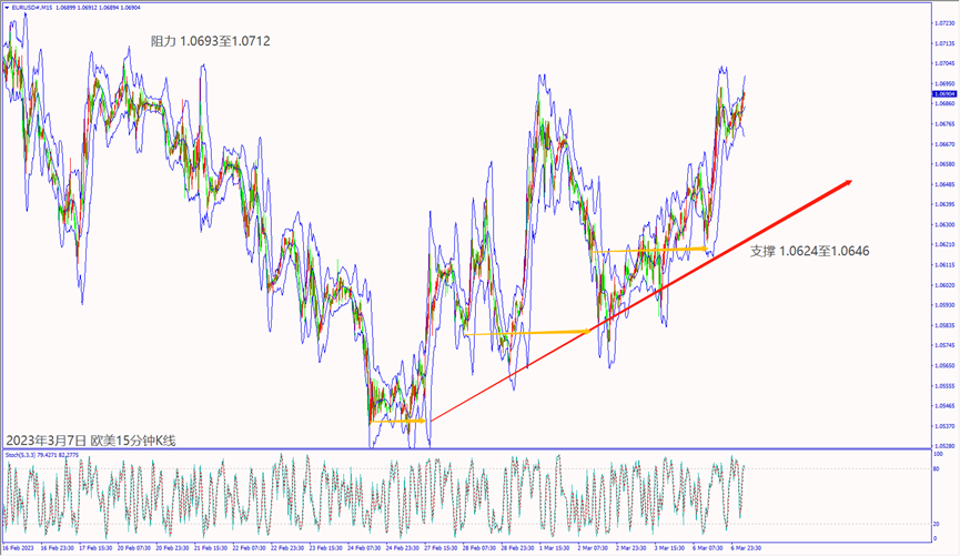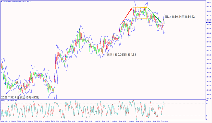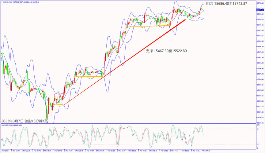 昨天(6日)美国公布经济数据利好,一度带动道琼斯和纳指上涨近1%。受到冬季风暴影响恐冲击经济,造成美股尾盘转跌吞噬当日涨势。预期今天(7日)欧洲央行官员重申3月持续加息,德指一旦跌破小时布林带下轨线15,597,建议可短空操作。预期今天美联储主席鲍威尔重申持续加息抑制通胀,纳指冲不过小时布林带上轨线12,382,建议可短空操作。