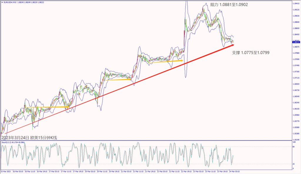 昨天(23日)市场担忧瑞信AT1债券恐冲击经济,利淡欧美股指下跌约2%。预期今天(24日)欧元区公布经济数据大都利好,德指若守住5日均线15,149,建议可短多操作。预期今天美国公布经济数据不佳,道琼斯一旦跌破10日均线32,120,建议可短空操作。