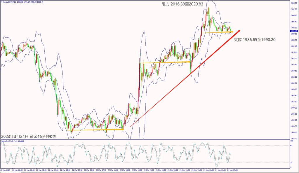 昨天(23日)亚洲市场抛售美元,以及市场担忧瑞信AT1债券恐冲击经济,市场买盘带动黄金价格上涨约40美元,尾盘回落至1995美元附近整理。预期今天(24日)美国公布经济数据不佳利淡美元,黄金价格若守住小时布林带下轨线1984美元,建议可短多操作。