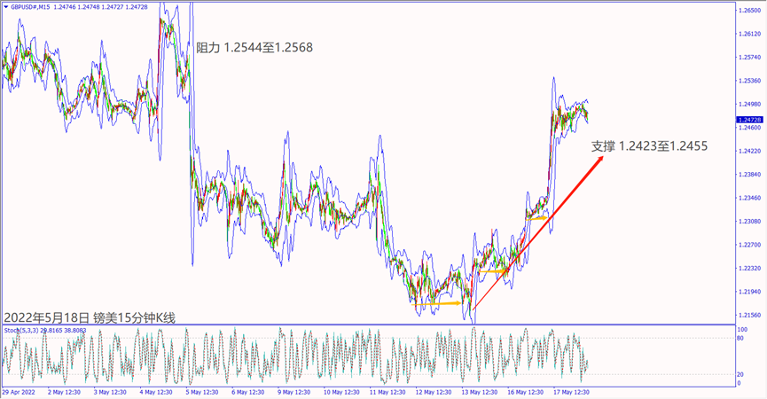 日级别线图,出现圆形底反转,1.2500关口若突破,有望延续涨势;15分钟K线,短线形成盘涨,守住上升趋势线,大有可能挑战前高阻力。