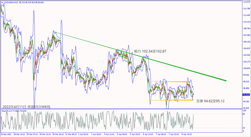 今天(11日)早上世界银行预测俄乌战争恐冲击全球经济,造成美油价格再度回落至95.50美元附近整理。今天伊朗和美国在核协议谈判中仍然没有结果,伊朗石油无法出口可能造成市场原油供给不足,美油价格一旦突破60日均线96.77美元,建议可短多操作。