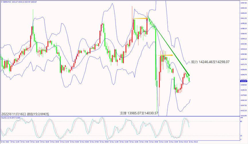 昨天(15日)多位美联储官员重申加息抑制通胀,造成道琼斯和纳指反转跌近2%。预期今天(16日)欧洲央行金融稳定报告下调经济增长,德指一旦跌破5日均线14,261,建议可短空操作。预期今天美国公布零售销售数据不佳,道琼斯若掼破小时布林带下轨线33,502,建议可短空操作。