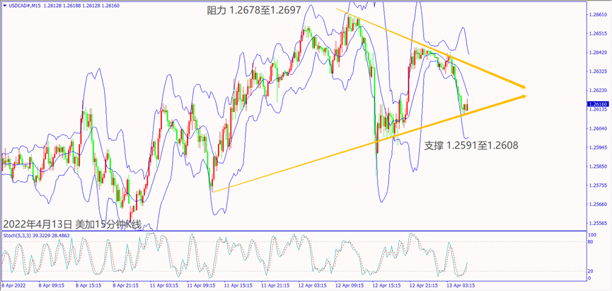 日级别线图,近三天在5日均线下方盘整,一旦突破该均线,可能出现反弹;15分钟K线,短线形成盘跌,下降趋势线若突破,大有可能挑战上方阻力。