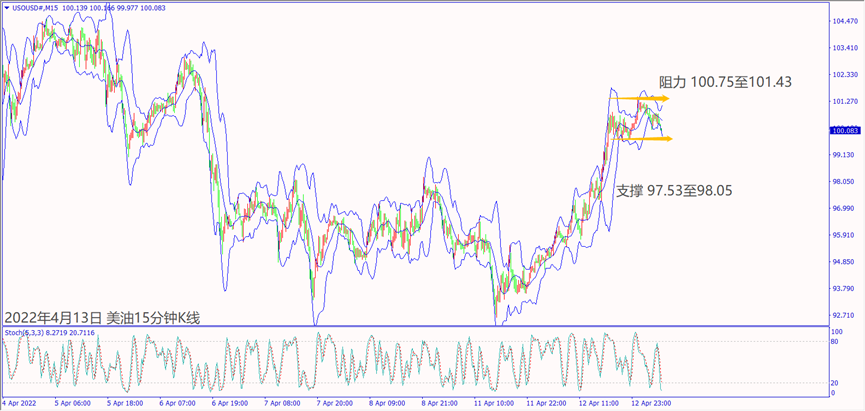 昨天(12日)欧盟表示制裁俄罗斯石油出口,欧佩克月度石油报告调降俄罗斯石油供给恐影响市场需求,带动美油重回100美元。预期今天(13日)美国公布EIA原油库存高于市场预期,美油价格一旦跌破小时布林带下轨线99.78美元,建议可短空操作。