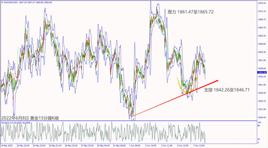 昨天(7日)美國財長耶倫對停滯性通脹示警,造成美元指數反轉大跌,帶動黃金上漲18美元沖上1850關口。今天亞特蘭大聯儲GDPNow預測模型最新數據表明美國經濟或處於衰退邊緣,一旦歐美股指反轉大跌,黃金價格若守穩5日均線1852美元,建議可短多操作。