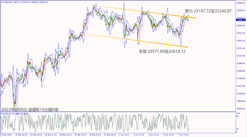 日級別線圖,近期處於震盪走勢,5日均線若跌破,可能再度下跌;15分鐘K線,短線出現下降楔形,趨勢線反壓沖不過,大有可能下探支撐。