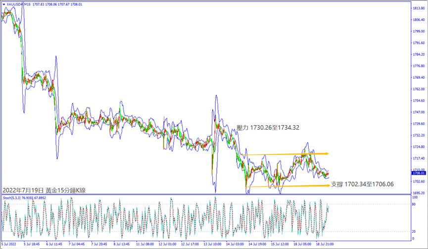 週一(18日)市場料美聯儲7月不會加息100個基點利淡美元指數,帶動黃金價格從早上低點上漲約15美元。晚間美元指數止跌反彈,也讓黃金價格反轉下跌。歐盟外長會同意禁止進口俄羅斯黃金,也讓黃金價格止跌守在1710關口附近整理。