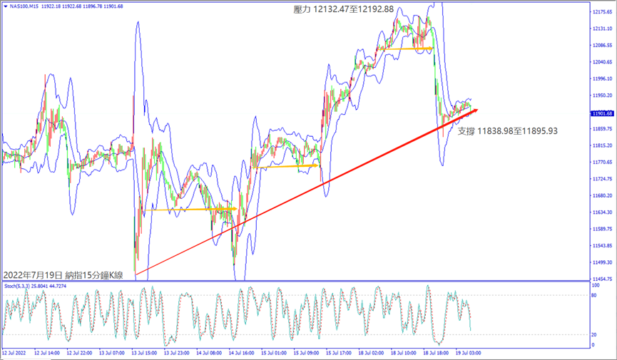 昨天(18日)受到油價大漲引發通脹再度升溫擔憂,道瓊斯和納指反轉大跌逾2%。預期今天(19日)歐元區公佈CPI數據持續攀升,德指沖不過小時布林帶中軌12,894,建議可短空操作。預期今天美國再度提出油價下降來抑制通脹,納指若守住5日均線11,863,建議可短多操作。