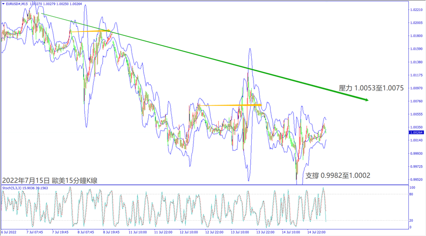 昨天(14日)兩位美聯儲官員稱不宜加息100個基點,今天(15日)亞洲市場拋售美元造成指數下跌約20個點。預期今天歐元區公佈貿易帳數據不佳,可能造成歐美和鎊美回調。預期今天美國公佈零售銷售和消費者信心指數不佳,可能造成美元指數出現大跌。