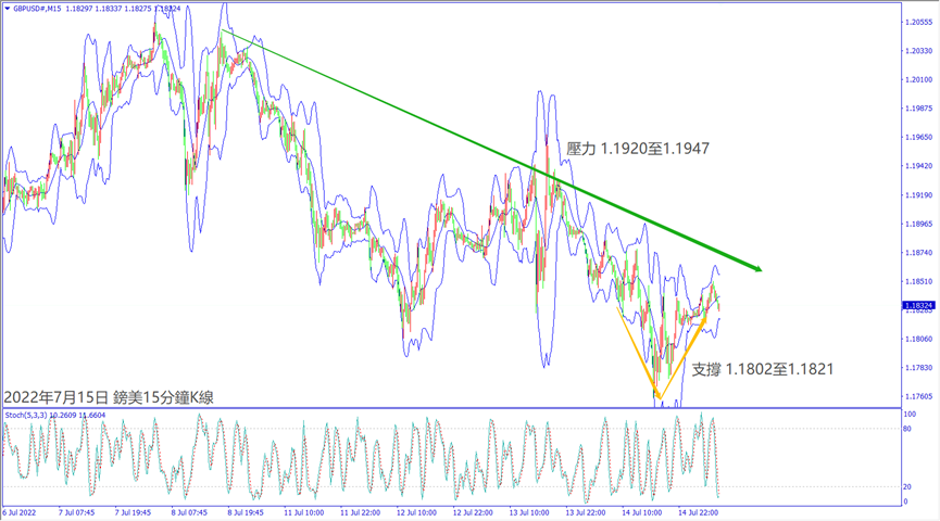 日級別線圖,近期大都在1.1900關口附近震盪,一旦突破5日均線,可能形成反彈;15分鐘K線,出現V型反轉,下降趨勢線若突破,大有可能挑戰起跌壓力。