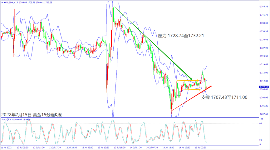昨天(14日)受到美元指數大漲影響,黃金價格一度從早上高點下跌約40美元,但是美國經濟問題造成美元指數回調,也讓黃金價格拉升至1710關口附近整理。預期今天(15日)美國公佈零售銷售和消費者信心指數不佳,一旦造成美元指數出現大跌,黃金價格若守穩小時布林帶中軌1710關口,建議可短多操作。