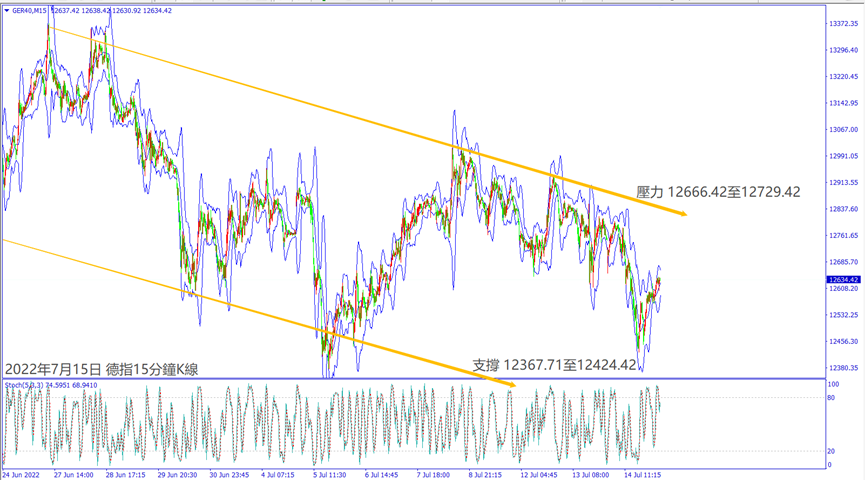 昨天(14日)受到美國經濟數據利淡,以及美聯儲官員稱不宜加息100個基點影響,美國道瓊斯和納指皆大跌後反彈收復當日跌勢。預期今天(15日)歐元區公佈經濟數據不佳,德指一旦跌破小時不林帶中軌12,567,建議可短空操作。預期今天美國公佈經濟數據大都不佳,納指沖不過5日均線11,794,建議可短空操作。