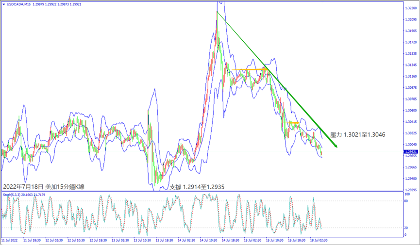 上週五(15日)美國總統拜登拜訪沙特,也讓沙特大臣表示正與OPEC+提供適當增產,利好美聯儲維持7月加息75個基點預測,今天(18日)早上亞洲市場拋售美元造成指數下跌約30個點。昨天(17日)據敘利亞國家通訊社報導,美國在敘利亞非法駐軍本月第三次盜運石油,早上美油價格V型反轉上漲有望帶動加元,不排除造成美加持續下跌。預期本週二(19日)早上澳州聯儲貨幣紀要提及加息,有望帶動澳美上漲。