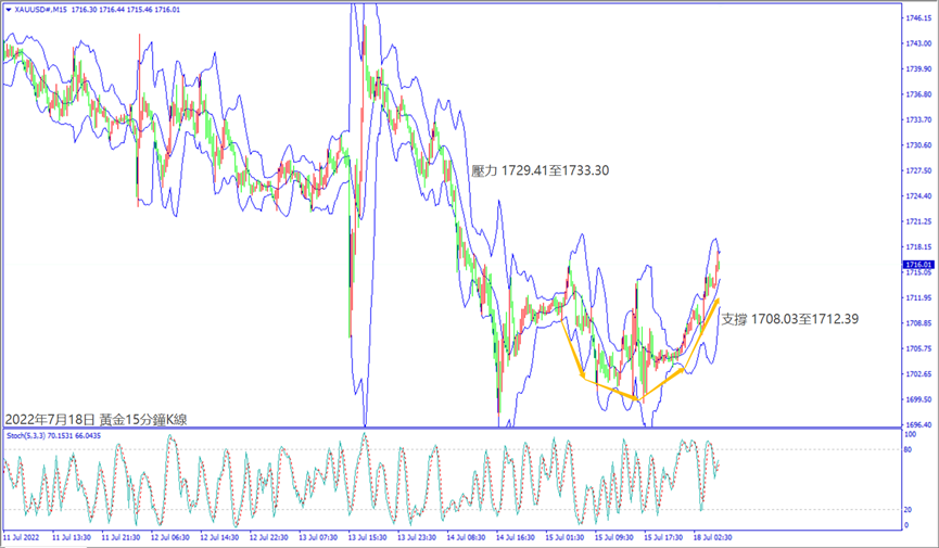上週五(15日)美國公佈經濟數據好壞參半,造成美元下跌和美股上漲,黃金價格介於1710美元附近震盪。美聯儲多位官員預期7月維持加息75個基點利淡美元,一旦美元指數擴大下跌,黃金價格守住1710關口,建議可短多操作。