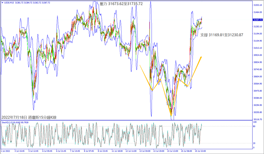 上週五(15日)美國公佈零售銷售和消費者信心指數利好,帶動道瓊斯和納指擴大上漲逾2%。預期今天(18日)歐洲央行官員重申7月加息25個基點,德指一旦跌破小時布林帶下軌線12,806,建議可短空操作。預期今天美國財報周傳出利好消息,道瓊斯守住小時布林帶中軌31,280,建議可短多操作。