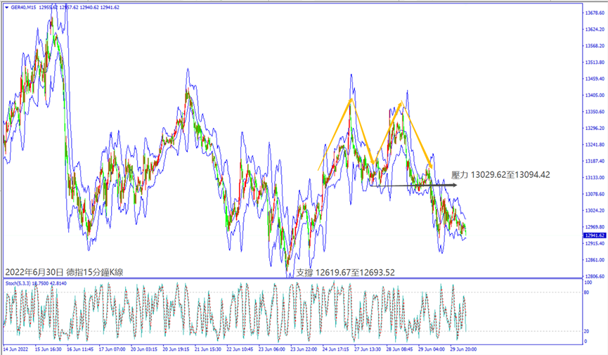 昨天(29日)美國公佈經濟數據大都不佳,但是在美聯儲主席鮑威爾對經濟表示樂觀,造成道瓊斯和納指200點震盪。預期今天(30日)英國和歐元區公佈經濟數據大都不佳,德指若跌破小時布林帶下軌線12,932,建議可偏空操作。預期今天美國公佈經濟數據大都不佳,納指若跌破10日均線11,652,建議可短空操作。