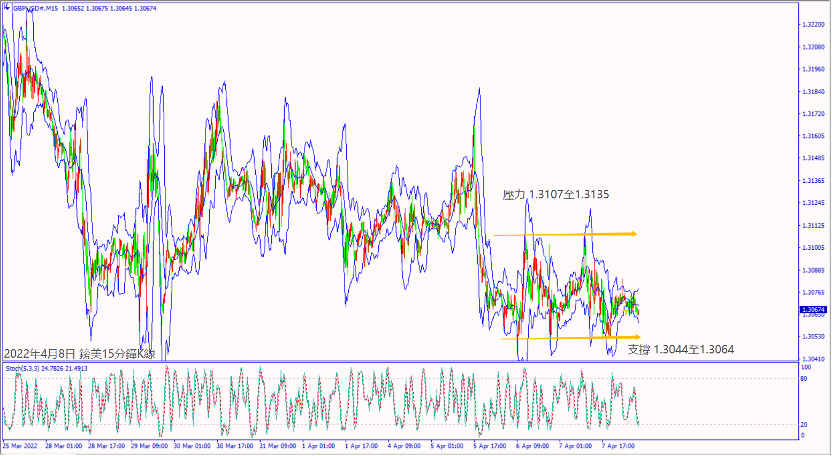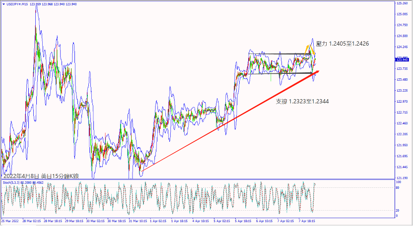 日級別線圖,近兩日在1.2400關口下方震盪,一旦跌破5日均線,可能轉跌;15分鐘K線,昨天出現假突破盤整頂部,盤整底部若摜破,大有可能下探支撐。
