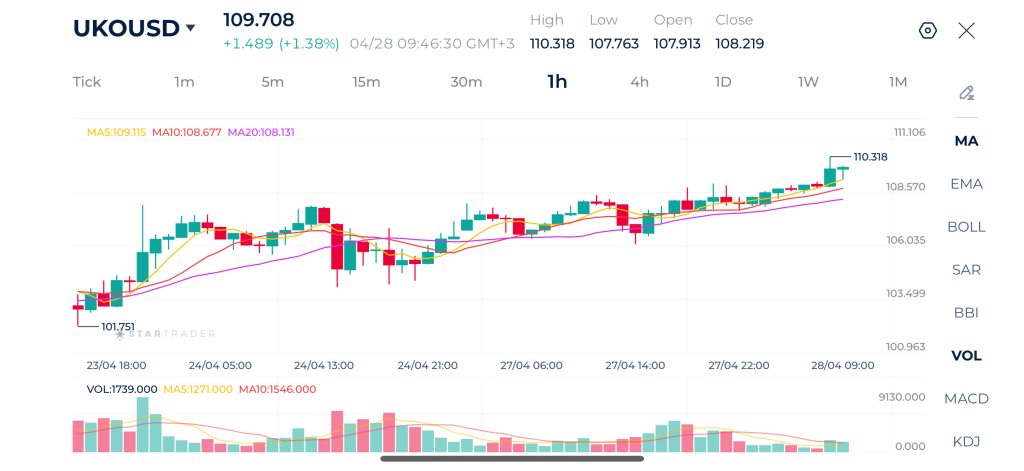 Giá dầu Brent hiện giao dịch quanh mức 109,71 USD sau khi tiếp tục đà tăng và thiết lập mức cao mới tại 110,32 USD. Diễn biến giá cho thấy xu hướng tăng rõ ràng, với cấu trúc đỉnh cao hơn và đáy cao hơn được duy trì liên tục.